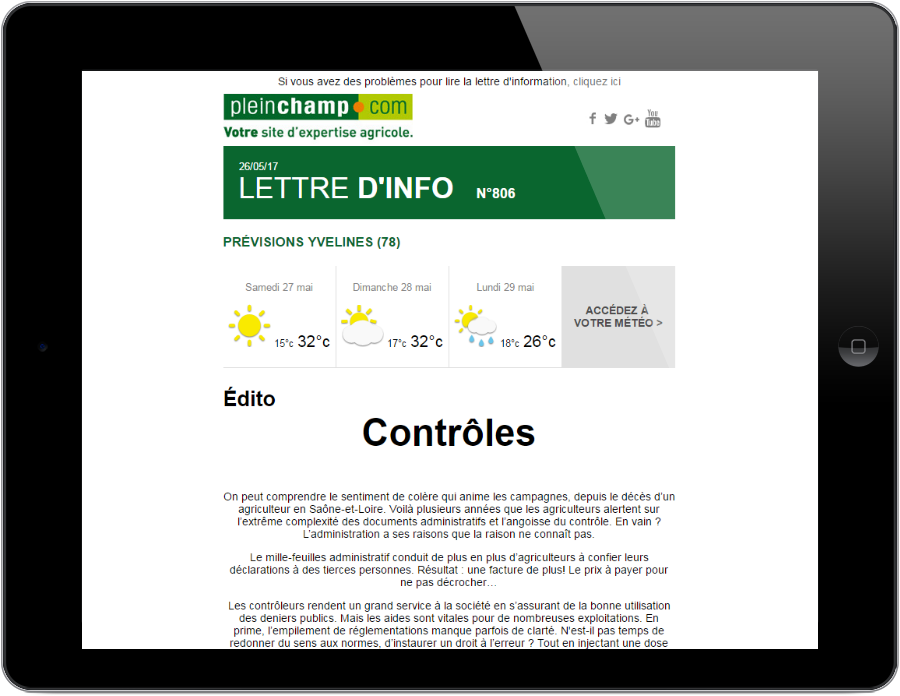 Personnalisez votre lettre d'information sur le site pleinchamp.com en vous inscrivant pour votre ou vos départements favoris.